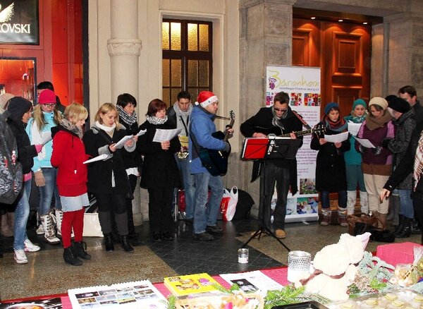 In der Mädlerpassage blieben viele Leute stehen, lauschten dem Gesang und gaben ihren Beifall. Bei klassischen Weihnachtsliedern wie Jingle Bells, Stille Nacht heilige Nacht, Guten Abend schön Abend und Happy Christmas verbreitete sich schnell Weihnachtsstimmung und die Spendenbox des Bärenherz füllte sich rasch.