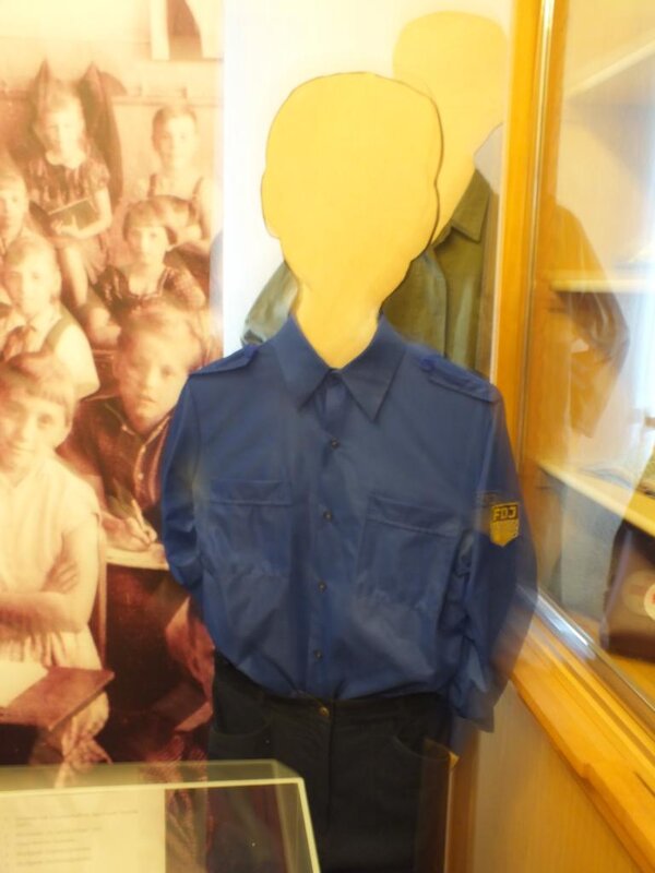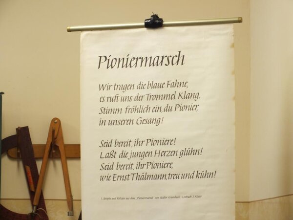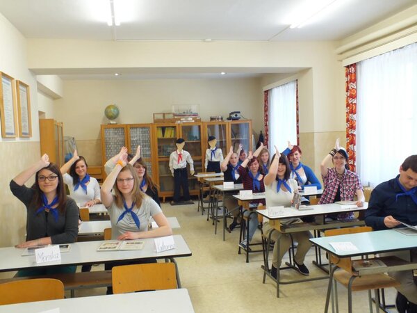 „Das Highlight unseres Besuches war die DDR- Schulstunde, die wir erlebten“, waren sich die angehenden Sozialassistenten einig. „Zur Vorbereitung der Schulstunde wurden blaue Pioniertücher ausgeteilt und umgelegt. Die Begrüßung war: „Für Frieden und Sozialismus seid bereit!“ – „Immer bereit!“ Die Stunde war in Form eines Rollenspiels aufgebaut, wo wir uns mit den damaligen Erziehungsmethoden und Bildungszielen auseinandersetzen mussten. Im Verlauf der Stunde wurden Lieder gesungen, dazu marschiert, die Gebote der Thälmannpioniere wiederholt und wir mussten aufstehen bei jeder Antwort oder Frage. Als Letztes haben wir Zweiergruppen gebildet und jede Gruppe durfte sich ein Zimmer im Museum aussuchen. Dieses Zimmer haben wir dann erkundet.“