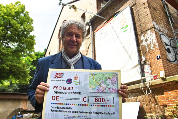 Mit einer Spende von 600 Euro aus dem Erlös der Aktion „ESO läuft!“ unterstützen die Euro-Schulen Halle die Beseitigung der Hochwasserschäden im Peißnitzhaus. Julia Wünsch, stellvertretende Schulleiterin der Berufsfachschule und Kersten Retzlaff, zuständig für die Buchhaltung der Euro-Schulen Halle übergaben am 28. Juni 2013 als Organisatorinnen des Benefizlaufes einen Scheck an den Vorsitzenden des Vereins „Peißnitzhaus e.V.“ Roland Gebert.