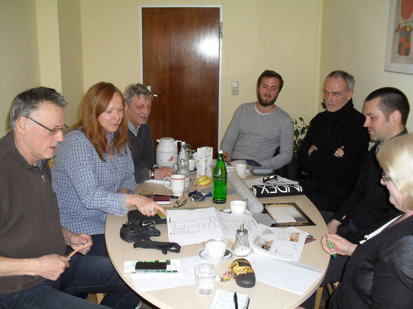 Von l. nach r.: Steffen Redlich (Projektmanagement ESO GmbH), Maria Kondring (Trägerleitung Kita Waldräuber), Karl-Heinz Neumann (Hausmeister Kita Waldräuber), Daniel Hambuch, Bernhard Knape, Simon Breth (alle Architekturbüro Brethdellacalle & Partner), Manuela Rusch (Pädagogische Leitung Kita Waldräuber).