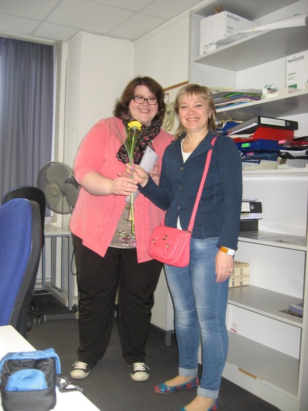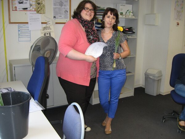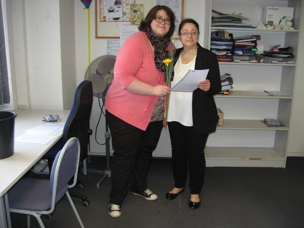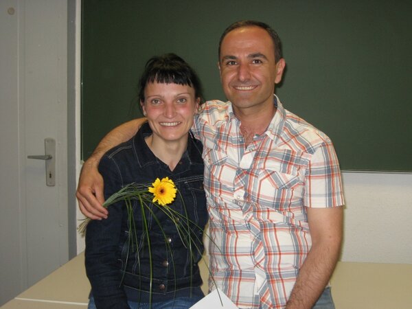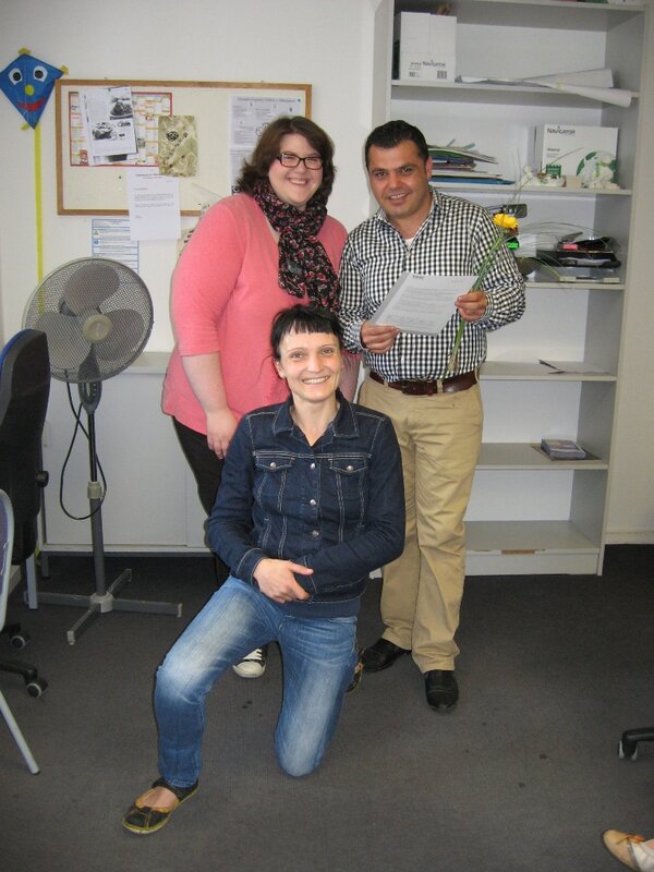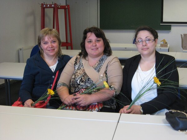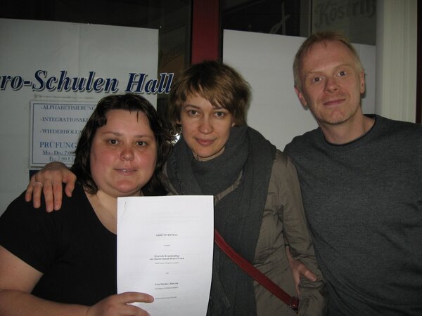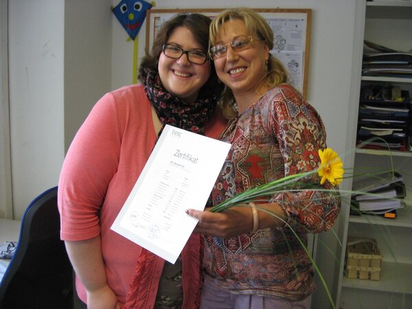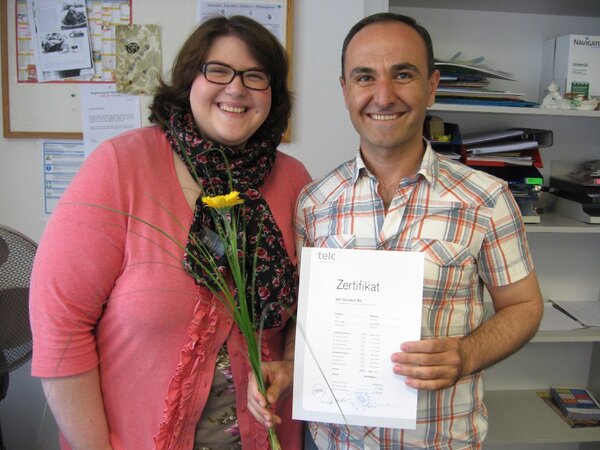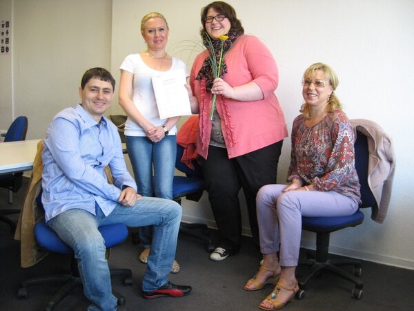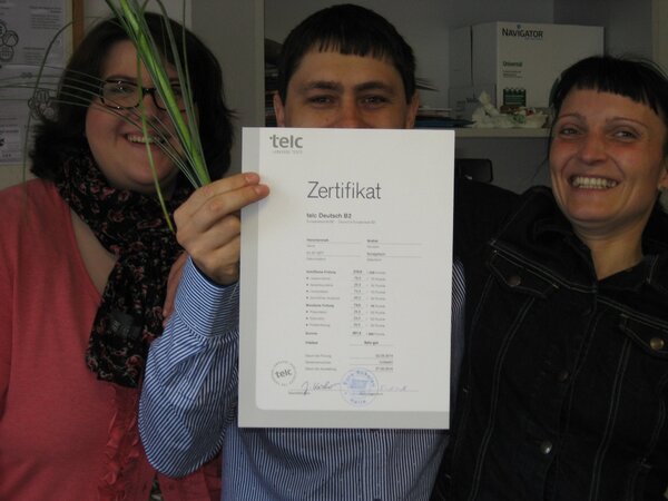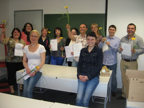 Heute war es endlich soweit. Nachdem die lang ersehnten Ergebnisse der Prüfung "telc B2" eingetroffen sind, luden die Euro-Schulen heute zur feierlichen Zeugnisausgabe. Wer im Anschluss an diesen Kurs mit Vermittlung von Fachsprache die Prüfung bestanden hat, hat nun viel bessere Chancen auf dem Arbeitsmarkt – ein Zeugnis, das gewissermaßen die Eintrittskarte ins Berufsleben darstellt. Nun kann es weitergehen mit Aus- oder Weiterbildung. Das Fundament ist gelegt. Ein gutes Beispiel ist Frau Balevska, die vor einigen Monaten erst nach Deutschland kam, und bei den Kursteilnehmern als "bulgarische Durchstarterin" gilt. Sie ist bereits als Pflegerin in Lohn und Brot – die Integration ist somit bei ihr innerhalb kürzester Zeit erfolgt. Ein besonderer Dank der Teilnehmer gilt den beiden in diesem Kurs eingesetzten Lehrkräften – Frau Brakhage und Frau Neiß - die allen stets kompetent und mit vollem Einsatz mit Rat und Tat zur Seite standen.