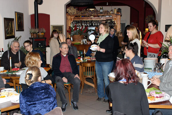 Im Rahmen des Projektes „17 Tage - 17 Essen“ zauberte der berufsbezogene Deutschkurs „Pflege“ in unserer Lehrküche verschiedene Gerichte, die dann am Abend in einem kleinen Lokal in der Altstadt von Görlitz angeboten wurden. Die Teilnehmerinnen des Kurses hatten verschiedene Salate, eine Rote-Beete-Suppe mit Teigtaschen, philippinisches Curry, Lasagne und andere Köstlichkeiten vorbereitet. Als Dessert ließen sich die zahlreichen Gäste polnischen Honigkuchen, syrische Pfannkuchen und ukrainische Schokoladenwurst schmecken.
