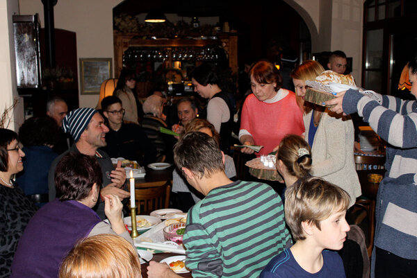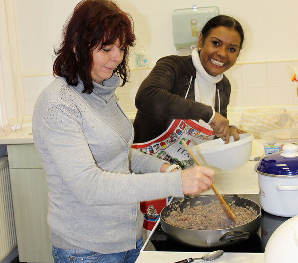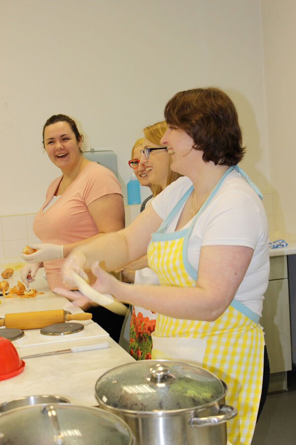 Im Rahmen des Projektes „17 Tage - 17 Essen“ zauberte der berufsbezogene Deutschkurs „Pflege“ in unserer Lehrküche verschiedene Gerichte, die dann am Abend in einem kleinen Lokal in der Altstadt von Görlitz angeboten wurden. Die Teilnehmerinnen des Kurses hatten verschiedene Salate, eine Rote-Beete-Suppe mit Teigtaschen, philippinisches Curry, Lasagne und andere Köstlichkeiten vorbereitet. Als Dessert ließen sich die zahlreichen Gäste polnischen Honigkuchen, syrische Pfannkuchen und ukrainische Schokoladenwurst schmecken.