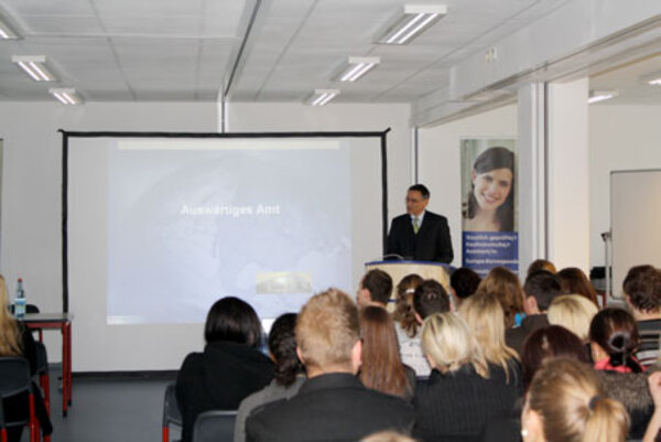 Französisch als Sprache der Diplomatie und Amtssprache der Vereinten Nationen eröffnet spannende berufliche Perspektiven im Auswärtigen Amt. Katja Behrends, Schülerin im zweiten Ausbildungsjahr zur Kaufmännischen Assistentin, Fremdsprachen und Korrespondenz an der Euro Akademie Hannover, hat die diplomatische Laufbahn für sich entdeckt und beherrscht neben Französisch die Sprachen Englisch und Spanisch. Das Auswärtige Amt ist regelmäßig an den Euro Akademien zu Gast und informiert über verschiedene Einstiegsmöglichkeiten. Das Bundessprachenamt ist ebenfalls ein gefragter Arbeitgeber und bietet spannende Tätigkeiten mit dem Schwerpunkt Dolmetschen & Übersetzen.