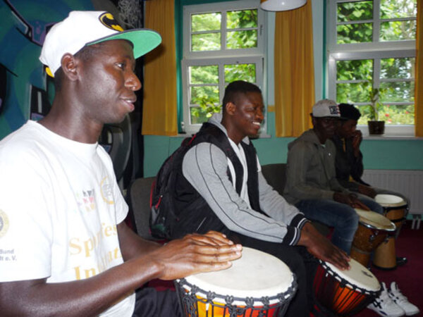 Einen weiteren Termin auf dieser Rundreise durch die Stadt bildete der „Kinder- und Jugendtreff im Lutherhaus“. Thomas Bork, Sozialarbeiter des Treffs, begrüßte die Jugendlichen und führte sie durchs Haus. Den Schwerpunkt des Besuchs bildete ein gemeinsamer Trommelworkshop mit Orlando Carmo-na Garcia, dessen Leidenschaft für Musik die jungen Leute sofort mitriss. Auch bei diesem Besuch wurde wieder deutlich, wie begeisterungsfähig und offen diese jungen Menschen sind.