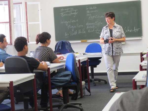 Die Beauftragte für Integration und Migration der Stadt Halle, Petra Schneutzer, stattete unserem Kurs für Asylbewerber am 6. Juli einen Besuch ab. Sie nahm sich viel Zeit auf die vielen Fragen der Teilnehmer einzugehen. Dafür bedanken wir uns sehr herzlich. Sie erklärte geduldig und in leicht verständlicher Sprache, welche Dinge in unserer Stadt zu beachten sind, wo geholfen werden kann und was ein Netzwerk zu leisten in der Lage ist.