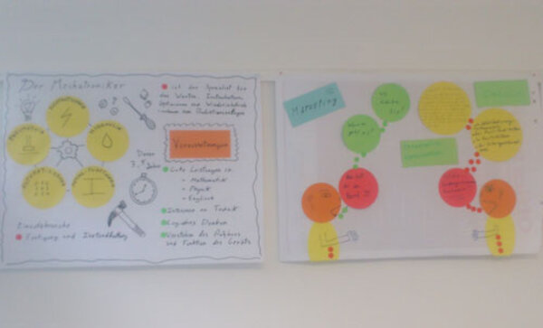 Die Teilnehmer wurden von Beginn an in zwei Gruppen aufgeteilt. Eine Gruppe, die bereits über sehr gute Sprachkenntnisse verfügt, beschäftigte sich vergangene Woche intensiv mit den Ausbildungsberufen, die sie im Juli voraussichtlich beginnen werden. Dazu bildeten sie Kleingruppen und recherchierten eigenständig die Inhalte, Anforderungen, Voraussetzungen und Einsatzgebiete verschiedener Ausbildungsberufe wie Koch, Hotelkaufleute, Restaurantfachleute, Systemgastronomen und Mechatroniker.