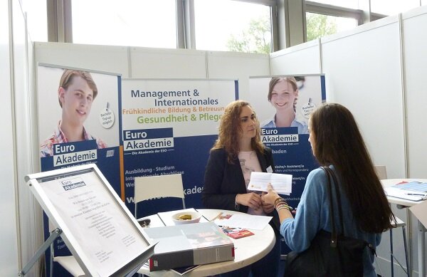 Interessierte konnten sich aus erster Hand über die Ausbildungen an der Euro Akademie zum Fremdsprachenkorrespondenten, zum Kaufmännischen Assistenten mit den Schwerpunkten Fremdsprachen und Korrespondenz oder Informationsverarbeitung, sowie zum Sozialassistenten im persönlichen Gespräch informieren. Für Schüler, die noch keinen <link internal-link>Mittleren Bildungsabschluss aufwiesen, war vor allem der Vorbereitungskurs an den Euro-Schulen Rhein-Main zum Mittleren Bildungsabschluss interessant.