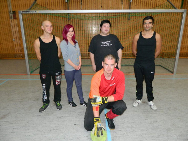 Bild oben v.l.n.r.: Constantin Plättner, Nicole Rudolph, Tim Müller, Martin Chabowski und Torhüter Roberto Lang