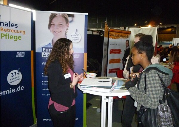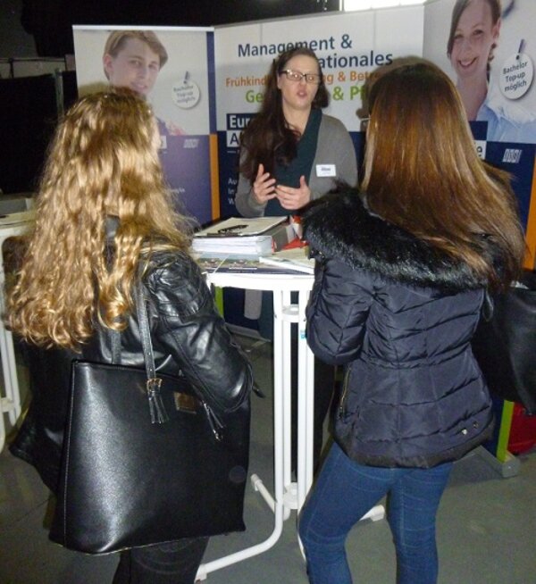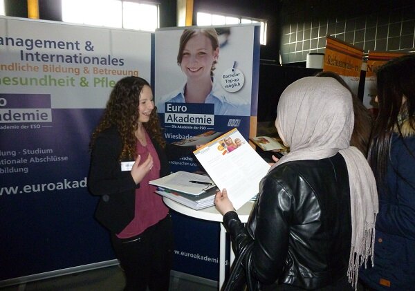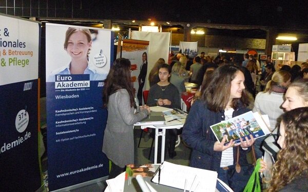 Am 11. und 12. März waren die Euro-Schulen Mainz und <link internal-link>Wiesbaden Aussteller auf der Berufsinformationsmesse in Wiesbaden. Viele Schüler und Eltern, die sich am Stand der Euro-Schulen einfanden, wurden umfassend vom Team informiert und beraten. Sie erhielten im persönlichen Gespräch wertvolle Informationen aus erster Hand über den nachträglichen Erwerb des <link internal-link>Mittleren Bildungsabschlusses oder der Weiterbildung zum <link internal-link für büro- und projektorganisation>Fachwirt für Büro- und Projektorganisation IHK.