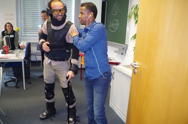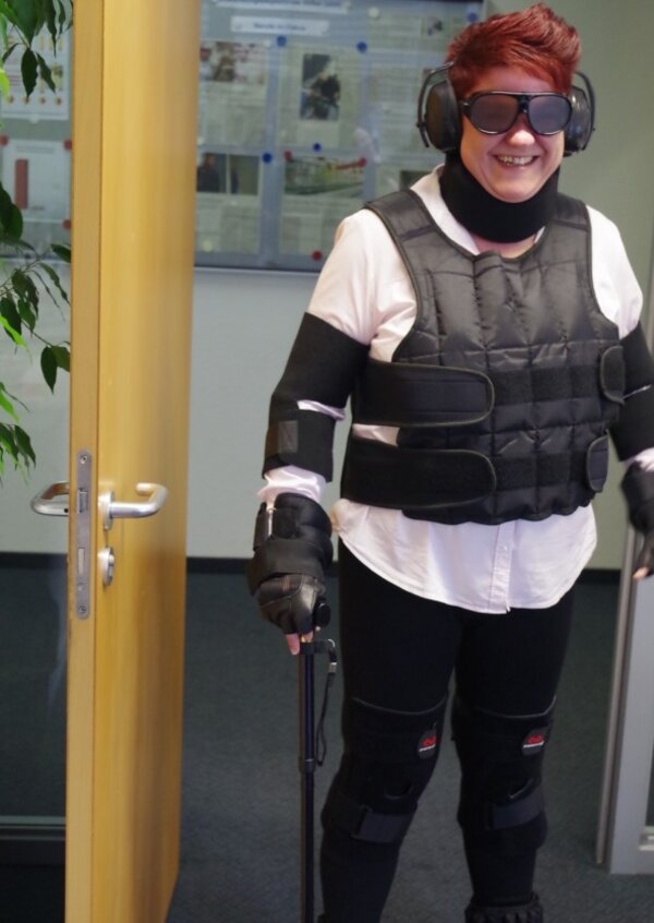 Besonderes Interesse erweckte der „Alterssimulationsanzug“ aus dem Ausbildungsbereich Altenpflege und die damit gebotene Möglichkeit, durch eigenes Erleben die altersbedingten Veränderungen des Körpers nachzuempfinden und somit auch Verständnis für bestimmte Handlungen und Reaktionen älterer Menschen zu entwickeln.