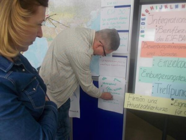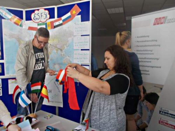 Teilnehmer des <link internal-link für den>ESF-BAMF-Kurses ESF 30 stellten das Thema Internationalität, Kultur und Sprache vor. Mit Hilfe einer Weltkarte zeigten sie, aus welchen Ländern sie kommen und wie in ihren verschiedenen Muttersprachen der Satz „Wir lernen Deutsch bei den Euro-Schulen“ geschrieben wird. Außerdem stellten Sie den Passanten mit einem Augenzwinkern und dem zusammengesetzten Substantiv "Rindfleischetikettierungsüberwachungsaufgabenübertragungsgesetz" die Frage: „Ist die deutsche Sprache etwa eine schwere Sprache?“.