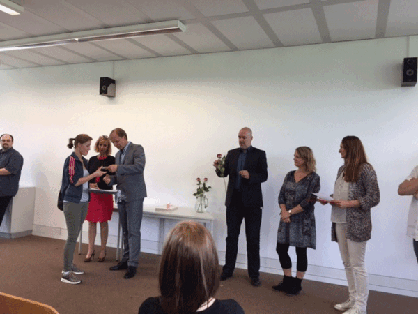 Die Übergabe der Zeugnisse und der staatlichen Anerkennungsurkunden fand ab 12.30 Uhr in feierlichem Rahmen statt. Anwesend waren Herr Wienbeck, der sich im Rahmen seiner Ansprache ausdrücklich für die gute Kooperation bedankte, der Kursleiter Herr Strauß, die beiden Prüfer (ein staatl. Prüfer und ein freiberuflicher Dozent), Frau Schulz-Meier und im Hintergrund die übrigen Lehrer/Ausbilder. Özgür Gökce, Geschäftsführer Euro-Schulen Märkischer Kreis, bedankte sich seinerseits ebenfalls für die gute Zusammenarbeit und unterstützte, so wie Herr Wienbeck, die Idee, dieses gelungene Konzept weiterzuführen.