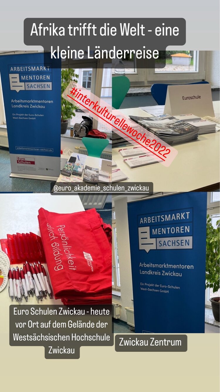 Wir, das Projektteam der Arbeitsmarktmentoren der Euro-Schulen Zwickau, waren am Samstag, den 1. Oktober 2022 in der Westsächsischen Hochschule zu Gast. Hier fand, unter dem Motto „Afrika trifft die Welt – Eine kleine Länderreise“, auf dem Campusgelände in der Innenstadt von Zwickau eine Begegnungsveranstaltung im Rahmen der Interkulturellen Woche statt.