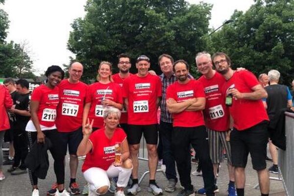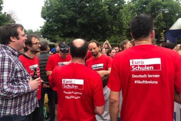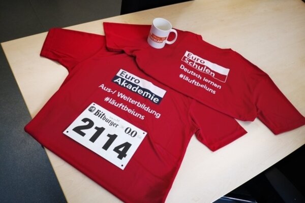 Die knallroten Team-Shirts mit dem Hashtag #läuftbeiuns waren ein richtiger Hingucker. Die Kolleg*innen machten durch den Aufdruck auch auf die Produkte aufmerksam: „Deutsch lernen“ und „Aus-/Weiterbildung“ war dort in großen Lettern zu lesen.