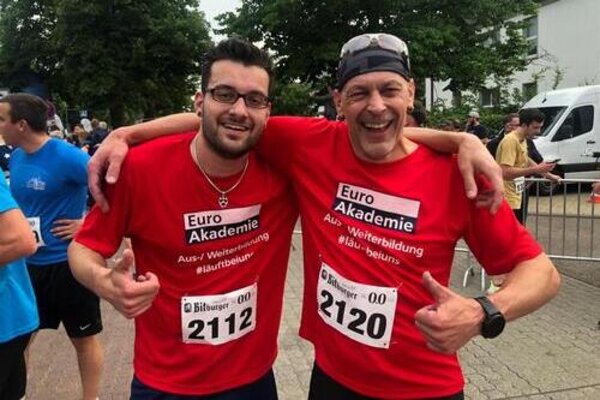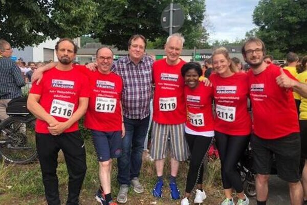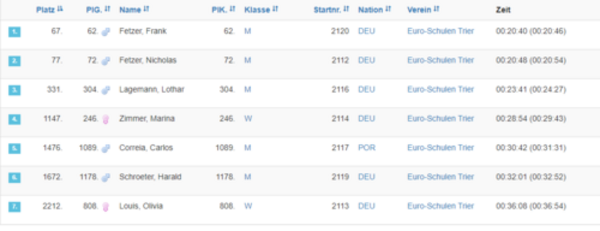 Die Euro Akademie und Euro-Schulen Trier stellten sieben Teilnehmende. Damit konkurrierten sie zwar nicht um das Team mit den meisten Mitgliedern, aber dennoch können sich die Leistungen der Mannschaft sehen lassen. Die beiden Fetzers erreichten sogar einen Platz unter den ersten hundert Finishern – das muss man erstmal hinkriegen: Frank Fetzer landete mit 20:46 Minuten auf Platz 67, Nicholas Fetzer, der nur 8 Sekunden langsamer war, schaffte es mit seiner Zeit auf Platz 77. Lothar Lagemann war der Drittschnellste im Team. Neben Carlos Correia und Harald Schroeter waren mit Marina Zimmer und Olivia Louis auch zwei Frauen in der Mannschaft.