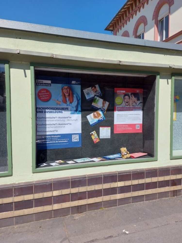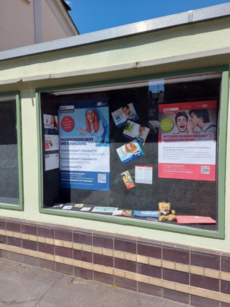 Das Team des Standortes Wiesbaden hat das Schaufenster, das wir seit einiger Zeit im größten Vorort, in Wiesbaden-Biebrich gemietet haben, neugestaltet. Dort sind nun einige Infos über unsere Integrations - und Berufssprachkurse und den Vorbereitungskurs auf die Externenprüfung zur Mittleren Reife zu sehen, die wir an der Euro-Schule Wiesbaden anbieten. Ergänzend weisen wir auf unsere Ausbildungen an unserer Höheren Berufsfachschule bei der Euro Akademie hin.