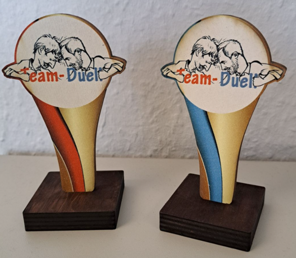 Insgesamt waren zehn Teams in fünf Duellgruppen unterwegs. Das Gesamtergebnis fiel eindeutig für die jeweils roten Teams aus. Jedes Siegerteam erhielt diesen einmaligen Sieger-Pokal: Rot = 4 Siegerteams, Blau = 1 Siegerteam