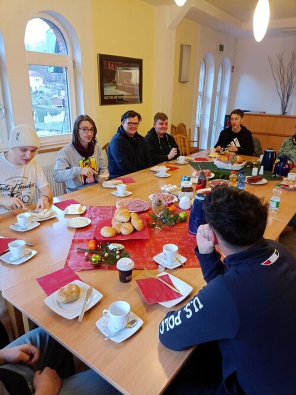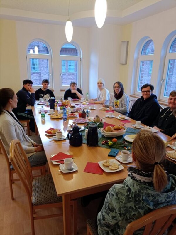 Vorangestellt war eine Kleingruppenexkursion, bei der die Teilnehmer*innen das kaufmännische Thema der "Warenbeschaffung/Bezugsquellen" am Beispiel des selbst festgelegten Bedarfs für das gemeinsame Frühstück erproben konnten. Dazu wurden insgesamt sechs Handelseinrichtungen in Pößneck aufgesucht und der Gesamtwert des Einkaufs ermittelt. Umsatz wurde schließlich in der Handelseinrichtung mit dem besten Gesamtpreis getätigt. Am Folgetag ging es dann an die Zubereitung, die Dekoration und schließlich an das gemeinsame Frühstück mit lockerer Diskussionsrunde über Wünsche und Geschenke, welche die Teilnehmenden schon für ihre Familien gekauft oder bei uns gebastelt hatten. Sicherlich kamen dabei die Kerzenhalter oder auch Aschenbecher aus Messing im Hammerschlaglook aus dem Berufsfeld Metall zu Hause sehr gut an.