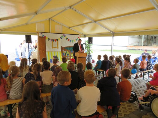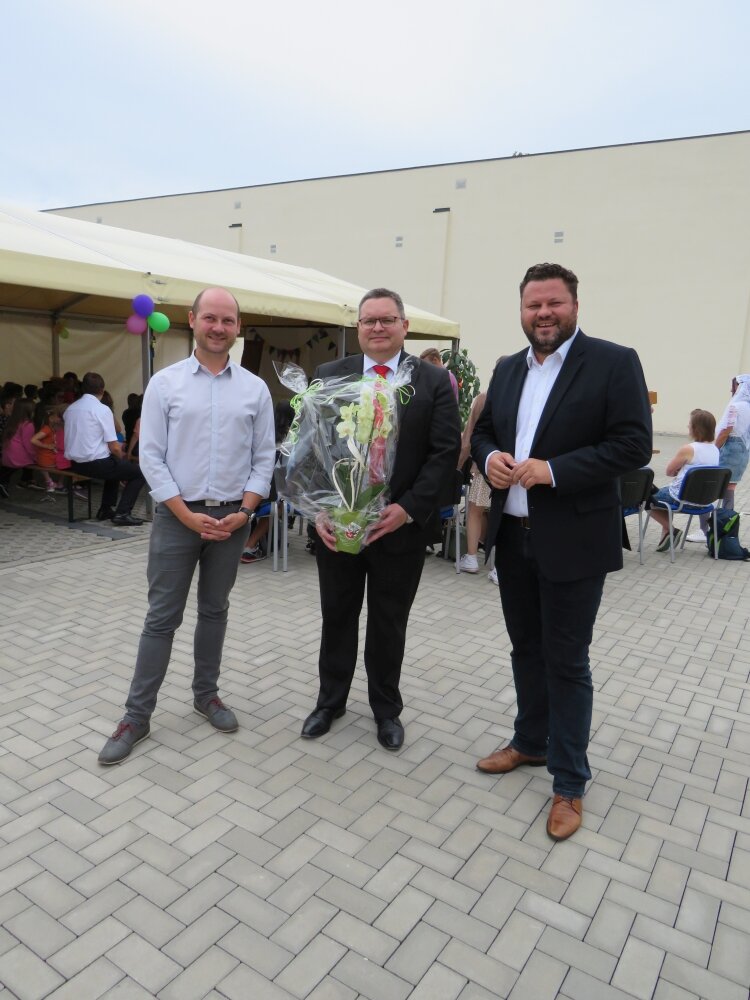 Standortleiter Tilmar Trentzsch und Schulleiterin Peggy Seifert begrüßten unter anderem den Oberbürgermeister von Hohenstein-Ernstthal, Lars Kluge, und den Bürgermeister von Oberlungwitz, Thomas Hetzel, die beide ihre Glückwünsche überbrachten und Erfolg für die nächsten 30 Jahre wünschten. Die unmittelbar benachbarten Einrichtungen, das Textil- und Rennsportmuseum sowie die Firma Gedat und weitere Partnerfirmen, waren ebenfalls vertreten. Der Geschäftsführer der Volkssolidarität Thomas Kühn und Felix Wöhrl vertraten den Kindergarten „Knirpsenland“ und unterzeichneten gemeinsam mit Tilmar Trentzsch eine Kooperationsvereinbarung zur langfristigen Zusammenarbeit.