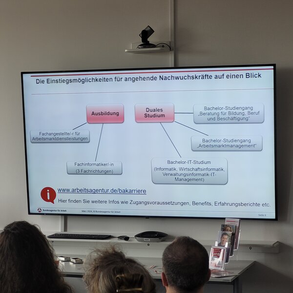Die 30 Teilnehmenden starteten am Dienstag in der Agentur für Arbeit Nord. Dort wurden die Ausbildungsberufe im Bereich Dienstleistung und öffentlicher Dienst, hier die/der Fachangestellte/r für Arbeitsmarktdienstleistungen, und das Duale Studium Arbeitsmarktmanagement (B.A.) bzw. Beratung für Bildung, Beruf und Beschäftigung (B.A.), vorgestellt. Eine Ausbildung bei der BA ist außergewöhnlich vielseitig. Schon von Beginn an arbeiten die Azubis an Projekten mit, nehmen an Kommunikationstrainings teil und schauen den Fachleuten über die Schulter. „Die enge Verknüpfung zwischen Theorie und Praxis stellt sicher, dass das Gelernte auch direkt angewendet werden kann“, bestätigte auch ein Studierender des Studienganges „Arbeitsmarktmanagement“. Die BA verfügt über eine eigene, staatlich anerkannte Hochschule mit Campus in Mannheim und Schwerin. Hier werden die zukünftigen Mitarbeitenden auf ihre späteren Aufgaben gut vorbereitet.