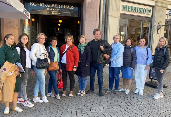 Im Anschluss an unser Projekt zur Fachkräftegewinnung sind auch weiterführende Kontakte mit Unternehmen entstanden. Ehemalige Projektteilnehmer*innen und aktuelle Sprachkursteilnehmende, mehrheitlich mit Berufsabschlüssen oder Interesse an einem Quereinstieg im medizinischen Bereich, besuchten einen großen Blutspendedienst in Leipzig.