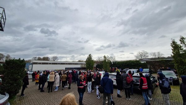Innerhalb von 110 Sekunden wurde das 5-stöckige Gebäude komplett geräumt. Alle rund 120 Teilnehmende und Lehrkräfte, die an diesem Tag Unterricht hatten, sowie unsere Verwaltungsmitarbeiter*innen haben an der Übung zur allgemeinen Zufriedenheit der Feuerwehr gut mitgemacht.