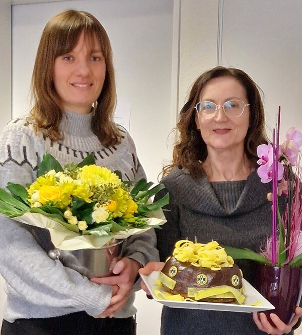 Aufgrund krankheitsbedingter/organisatorischer Umstände konnte eine offizielle Übergabe/Amtseinführung noch nicht erfolgen. Da die ersten beiden Wochen des Jahres jedoch schon sehr arbeitsintensiv waren, haben die Mitarbeitenden ihre Wertschätzung und den Unterstützungswillen in der Mittagpause nicht nur mit Kuchen und Blumen zum Ausdruck gebracht. Die Farbwahl von Blumen und Kuchendekoration ist dabei kein Zufall, sondern bezieht sich auf den favorisierten Fußballverein.