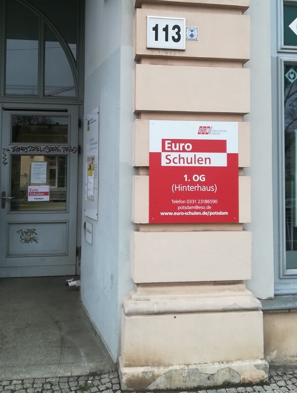 Auf einem an der Haustür befestigten Aufkleber ist die große Angebotspalette der Euro-Schulen Potsdam aufgelistet. Außerdem weist er Besucher*innen an, den hinter der Tür liegenden Innenhof zu durchqueren. Im Hintergebäude angekommen haben Besucher*innen dann die Wahl zwischen Fahrstuhl und Treppenhaus, um zum Eingang der Euro-Schulen zu gelangen. Dieser befindet sich im 1. Stock.