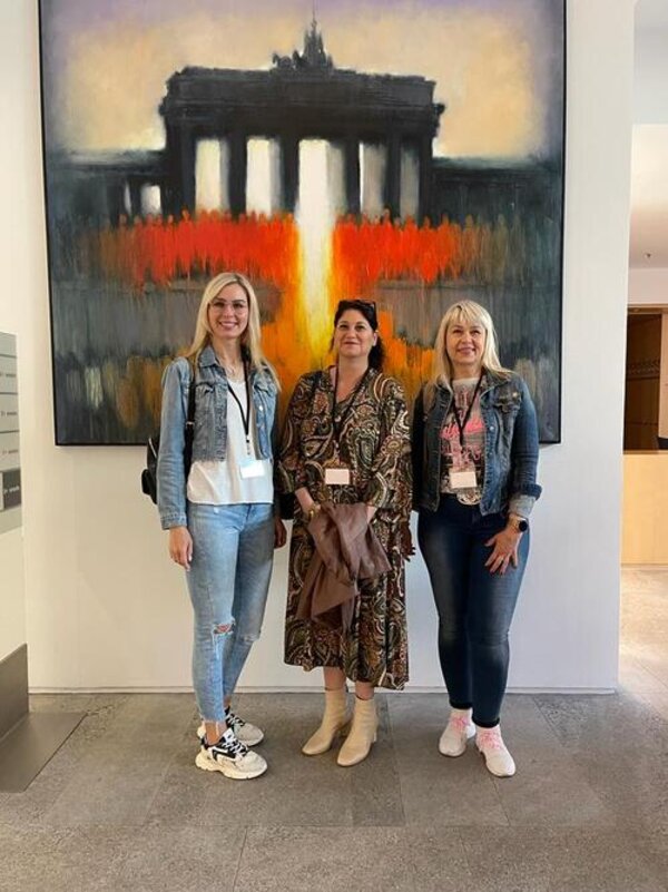 Am Eingang des Landtags geht es zunächst zu wie am Flughafen: Sicherheitscheck und Durchleuchtung aller mitgetragenen Gegenstände. Wir wurden sehr freundlich von zwei Angestellten in Empfang genommen und die Führung begann zunächst mit einer „Foto-Session“ vor dem Gemälde von Michael Apitz, welches im Foyer des Landtags hängt: Schlicht „9. November“ genannt, erinnert das abstrakte Werk an den Mauerfall in Berlin 1989.