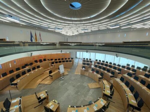 Die Gruppe konnte anschließend auf dem Besucherrang des Plenarsaals sitzen, erhielt Informationsbroschüren über die Sitzverteilung und die Abgeordneten des Landtags und hörte einen Vortrag über den Bau, die Arbeit der Abgeordneten, die aktuelle hessische Regierung und die Hintergründe des Föderalismus in Deutschland. Auch hier bot sich der Raum selbstverständlich für ein Erinnerungs-Foto-Shooting an, bevor es ins angrenzende Stadtschloss ging, welches der Herzog von Nassau hatte erbauen lassen.