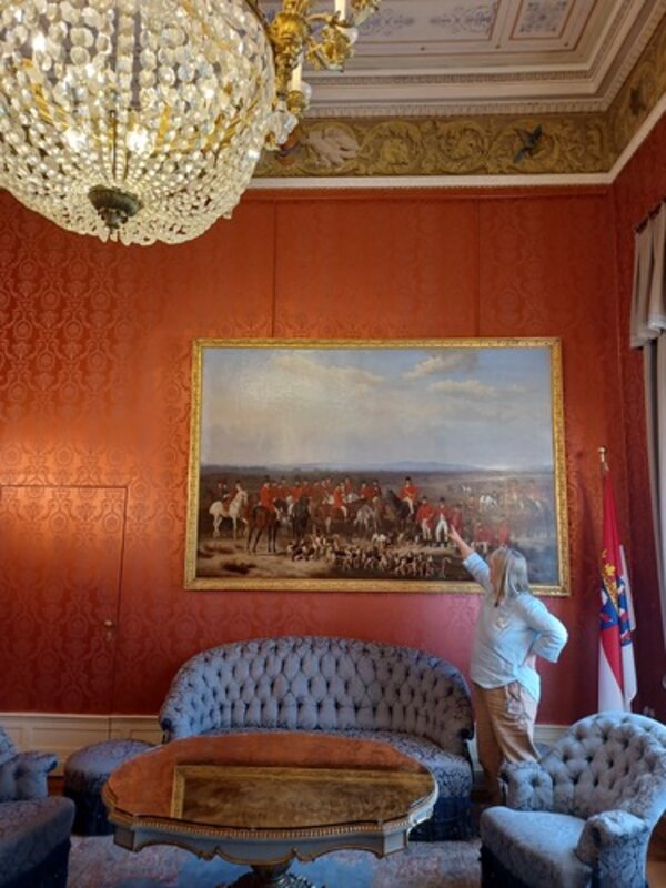 In den imposanten Räumen im Stilmix des 19. Jahrhunderts hörte die Gruppe weitere Vorträge über die Geschichte Wiesbadens und des Stadtschlosses. Selbst vielen Wiesbadener*innen ist nicht bewusst, dass mitten in ihrer Stadt ein Schloss steht, da meist nur die Sommer-Residenz, das Biebricher Schloss des Herzogs, bekannt ist.