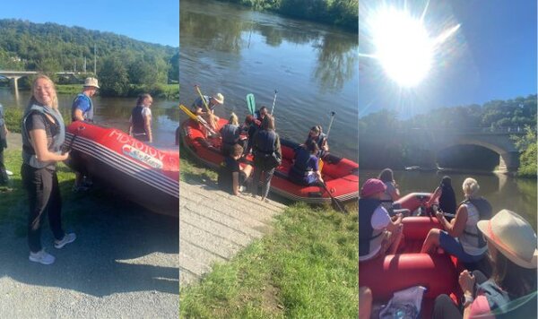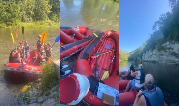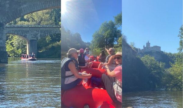 Unter dem Motto „Burgentour im Schlauchboot von Großheringen nach Naumburg“ starteten alle morgens pünktlich um 7:30 Uhr ab Zwickau mit dem Bus nach Großheringen. Die Tour begann gegen zehn Uhr in Großheringen und führte uns entlang der traumhaften, fast völlig naturbelassenen Flora und Fauna der Saale. Wir passierten hierbei atemberaubende Felsen - direkt aus dem Fluss aufsteigend, die Rudelsburg, Burg Saaleck, sowie Bad Kösen mit dem historischen Gradierwerk und das Landesweingut und Kloster Schulpforta.